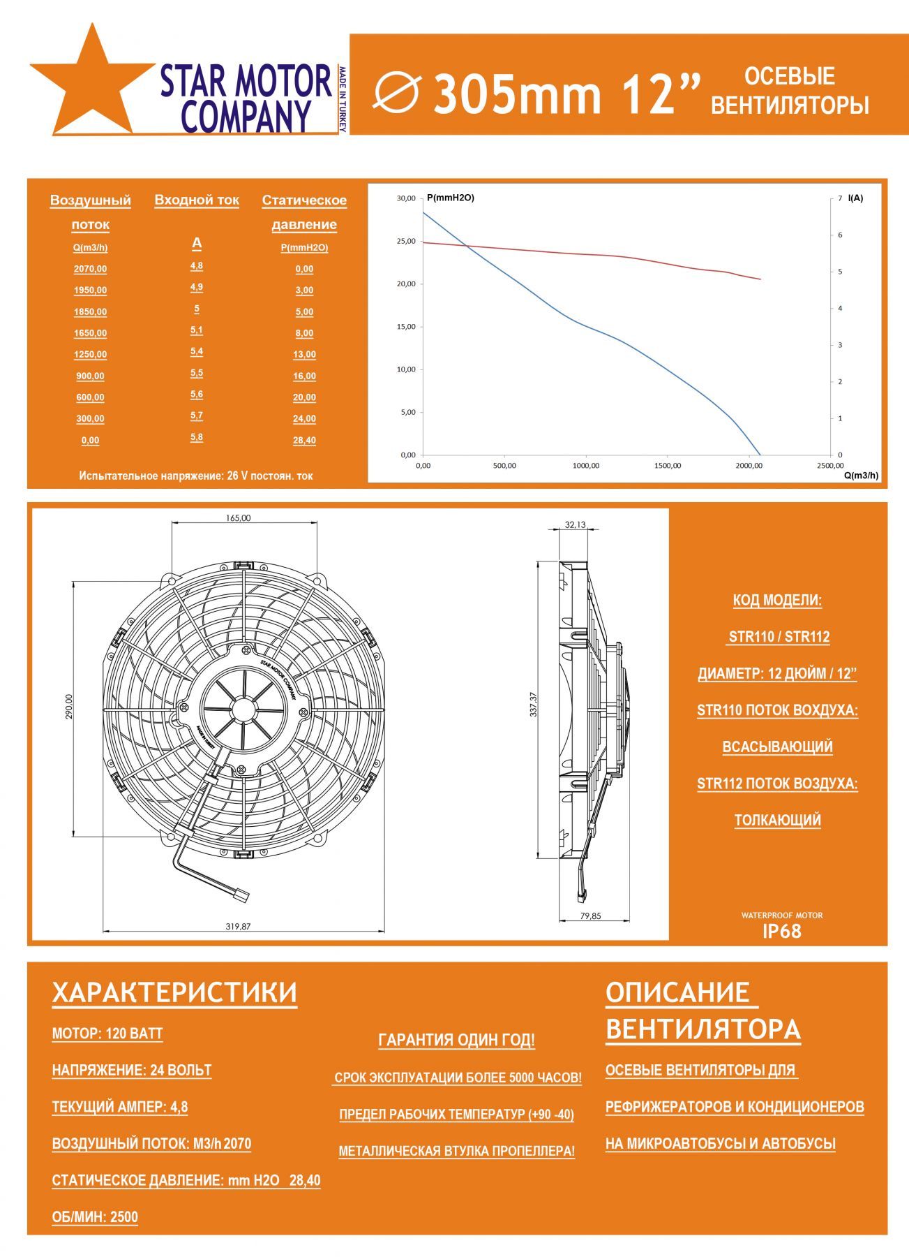 STR110 ОСЕВОЙ ВЕНТИЛЯТОР 12" ДЮЙМОВ 120 ВАТТ 24 ВОЛЬТ PULL / ВСАСЫВАЮЩИЙ ВЕНТИЛЯТОР ДЛЯ ИСПАРИТЕЛЯ РЕФРИЖЕРАТОРА, КОНДИЦИОНЕРОВ И РАДИАТОРОВ