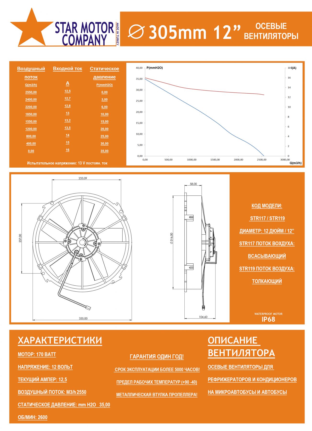 STR117 ОСЕВОЙ ВЕНТИЛЯТОР 12" ДЮЙМОВ 170 ВАТТ 12 ВОЛЬТ PULL / ВСАСЫВАЮЩИЙ ВЕНТИЛЯТОР ДЛЯ ИСПАРИТЕЛЯ РЕФРИЖЕРАТОРА, КОНДИЦИОНЕРОВ И РАДИАТОРОВ