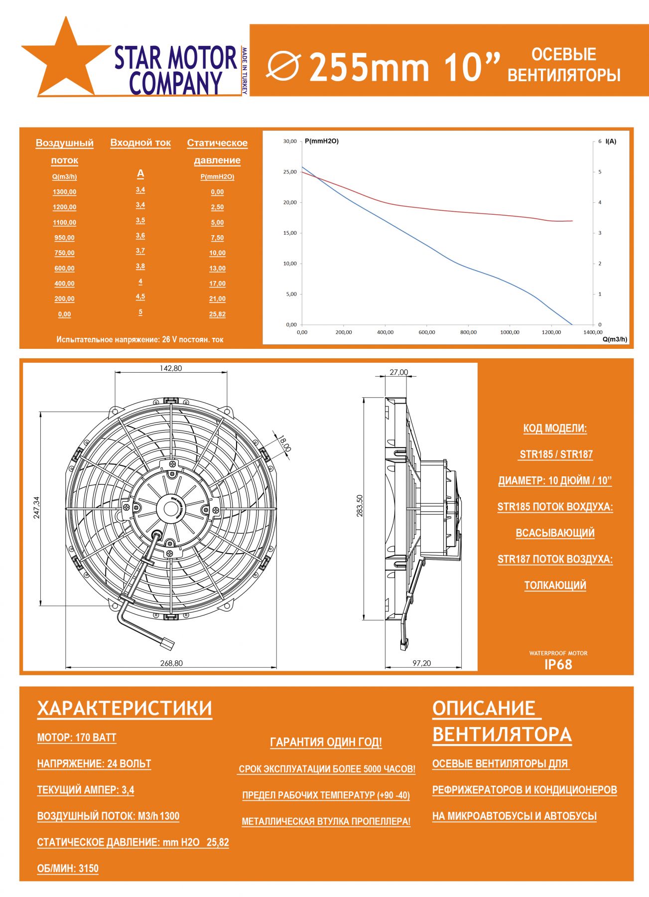 STR187 ОСЕВОЙ ВЕНТИЛЯТОР 10" ДЮЙМОВ 170 ВАТТ 24 ВОЛЬТ PUSH / ТОЛКАЮЩИЙ ВЕНТИЛЯТОР ДЛЯ ИСПАРИТЕЛЯ РЕФРИЖЕРАТОРА, КОНДИЦИОНЕРОВ И РАДИАТОРОВ