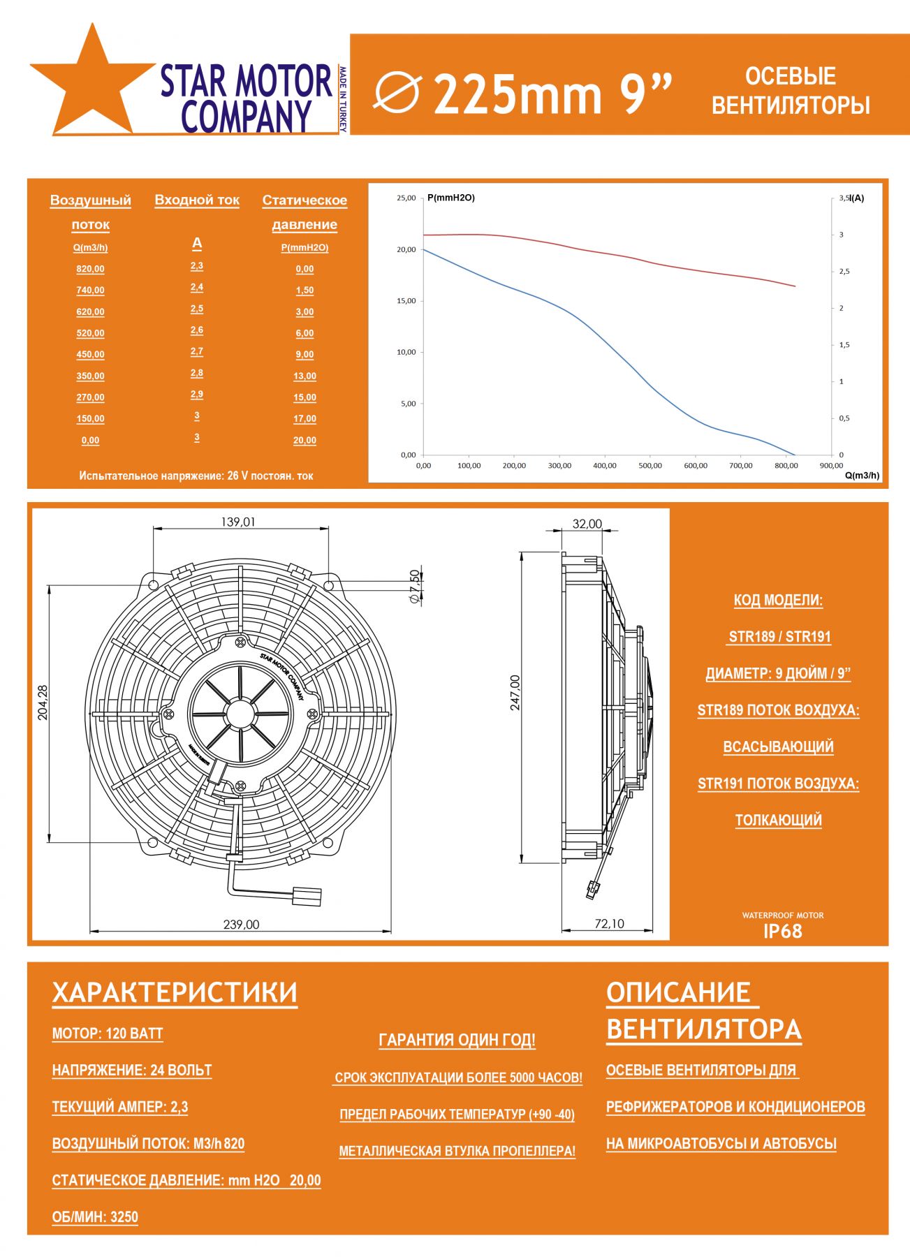 STR189 ОСЕВОЙ ВЕНТИЛЯТОР 9" ДЮЙМОВ 120 ВАТТ 24 ВОЛЬТ PULL / ВСАСЫВАЮЩИЙ ВЕНТИЛЯТОР ДЛЯ ИСПАРИТЕЛЯ РЕФРИЖЕРАТОРА, КОНДИЦИОНЕРОВ И РАДИАТОРОВ